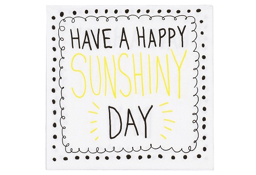 Ein lockerer Spruch sorgt für Gesprächsstoff auf Ihrer Gartenparty! Die Servietten von PAPER + DESIGN sind hierfür genau die richtige Wahl. Der Spruch "Have a happy sunshiny Day" sorgt bestimmt bei jedem Ihrer Gäste für ein kleines Lächeln im Gesicht. Die Servietten haben eine Maße von 33 x 33 cm. Die Packung beinhaltet 20 Stück.