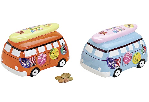 Schnell noch die Urlaubskasse auffüllen? Die niedlichen Spardosen mit dem Surfbrett auf dem Dach, machen einfach Lust auf Sonne, Sommer und Urlaub! Die Spardosen sind in zwei Farben erhältlich und aus Keramik gefertigt. Der Bulli lässt sich mit einem Stopfen-Verschluss im Boden verschließen. Die Maße beträgt 16 x 11 x 11 cm. Wir wünschen einen erholsamen Urlaub.
