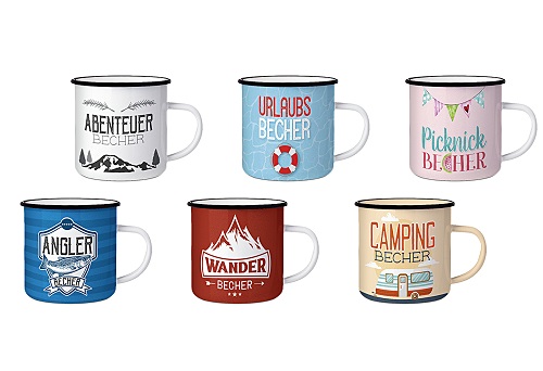 Besonders geeignet für den Campingurlaub oder die Ferienwohnung mit Selbstverpflegung, sind die Emaillebecher "Outdoor" mit einem Fassungsvermögen von 300 ml. Auch für Liebhaber mit einem besonderen Hobby sind sie ein schönes Mitbringsel bei der nächsten Gartenparty. Die Becher werden mit folgenden Motiven angeboten: "Abenteuerbecher", "Urlaubsbecher", "Picknickbecher", "Anglerbecher", "Wanderbecher" und "Campingbecher"